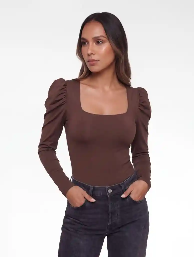 Este body de moda manga larga embombada y con escote cuadrado te va a enamorar gracias a su estilo, este clásico diseño que te hará lucir elegante y sofisticada. Ideal para una cena formal combinado con unos botines altos y un palazzo o con unos jeans anchos y cómodos para salir de rumba. Su tela es doble adelante y atrás lo que hace que tu figura horme divino. Es super fresco y suave. - Panty tipo tanga. - Hecho responsablemente por mujeres colombianas - Material: 93% Poliéster y 7% Spandex (Forro y Exterior). 2 capas de tela en el delantero y gafete graduable. - La modelo usa talla S y mide 1.70
