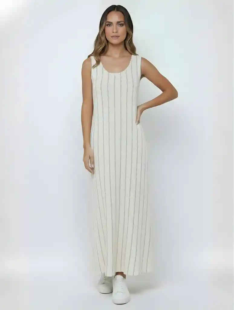 Vestido largo de silueta amplia con delicadas líneas verticales que estilizan la figura y aportan un toque elegante y minimalista 🤍 Perfecto para un look fresco, cómodo y versátil que puedes usar de día o de noche. 🏃🏻♀ Tela con excelente caída y fácil cuidado: ideal para llevar en la maleta sin preocuparte ✨ Diseño sin mangas con hombros anchos que estilizan la parte superior y equilibran la silueta ☀ Tela suave, ligera y fresca, perfecta para todos los climas 👗 Cubre de la talla S a la XL 🧵 Hecho responsablemente por mujeres colombianas: moda con propósito 📏 Cubre de la talla S a la XL (talla única) 👖 Material: 93% poliéster – 7% spandex 📸 La modelo mide 1.70 m y usa talla S