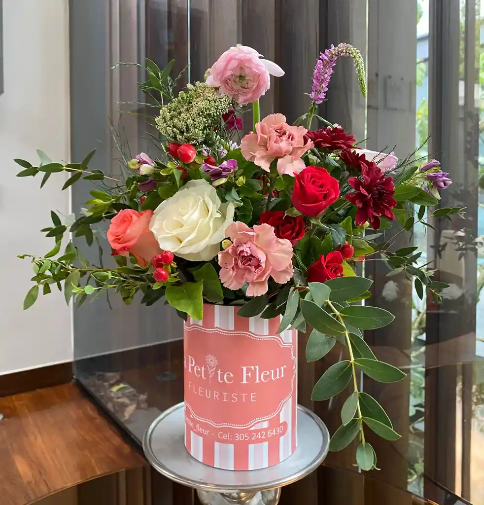 Arreglo de flores frescas en caja decorativa. Variedades y colores de flores sujetos a disponibilidad en tienda. *Imágenes de referencia. En caso de tener requerimientos específicos, dejarlos en los comentarios.