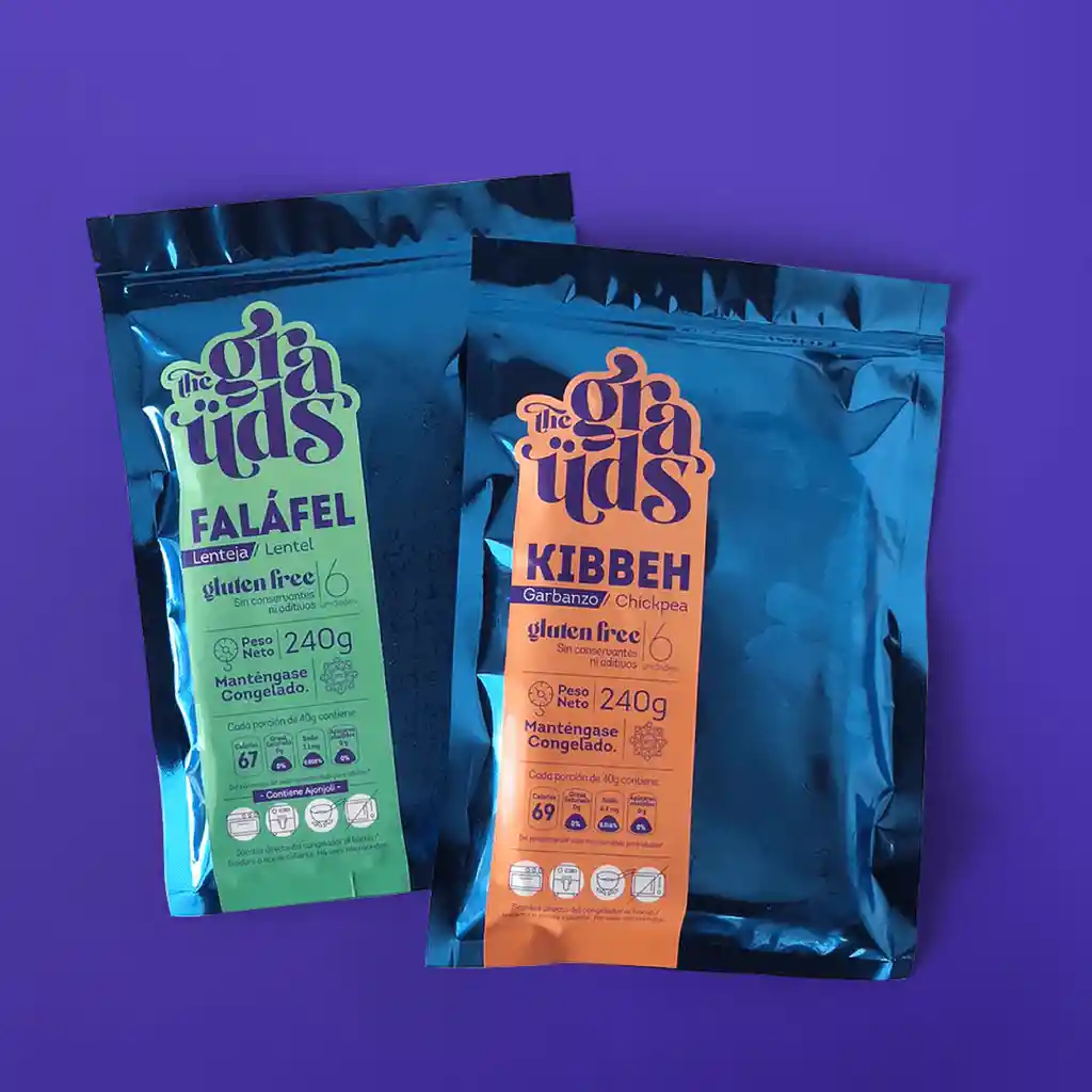 2 paquetes de The Grauds: 1 de Faláfel + 1 de Kibbeh. 6 croquetas congeladas de Kibbeh de garbanzo y 6 croquetas congeladas de Faláfel de Lenteja 100% natural en cada paquete. Gluten free, sin conservantes ni aditivos, 0 azúcares añadidos y 0 grasas saturadas. ¡Sácalos del congelador al aceite caliente u horno y voila! Listos para disfrutar.