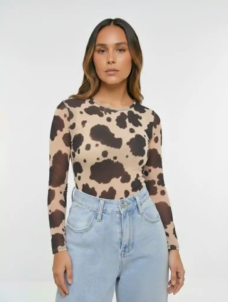 Este body es en mesh / malla suave, fresco y no se arruga, lo que lo convierte en la prenda perfecta para viajar o para usar todo el día con total libertad. Tiene escote recto al frente y un leve escote en la espalda, lo que realza la figura sin perder soporte. El estampado tipo vaca en tonos tierra lo hace muy versátil y fácil de combinar, ya sea con jeans o prendas más estructuradas. 🏃🏻♀ Tela que no se arruga: perfecta para viajar ☀ Tela suave, ligera y fresca: ideal para todos los climas 👗 Diseño versátil: perfecto para looks casuales o más atrevidos 🧵 Hecho responsablemente por mujeres colombianas: moda con propósito 📏 Cubre de la talla S a la L (talla única) 👖 Material: 93% poliéster, 7% spandex 📸 La modelo mide 1.70 my usa talla S