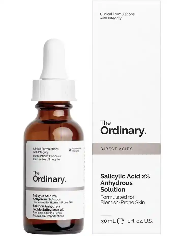 The ordinary Solución de ácido salicílico anhidro al 2%, suero exfoliante suave para imperfecciones, 30ml Qué es: Un suero no irritante a base de escualano formulado con ácido salicílico para descongestionar eficazmente la piel y exfoliar su superficie. Tipo de piel: Normal, mixta y grasa Preocupaciones de cuidado de la piel: Poros, acné e imperfecciones Ingredientes destacados: - Ácido salicílico: descongestiona y exfolia. - 4-T-butilciclohexanol: calma. Rutinas de ingredientes: Libre de parabenos, formaldehídos, agentes liberadores de formaldehído, ftalatos, aceite mineral, palmitato de retinilo, oxibenzona, alquitrán de hulla, hidroquinona, sulfatos SLS y SLES, triclocarbán, triclosán y contiene menos del uno por ciento de fragancia sintética. También es vegano, sin gluten y libre de crueldad animal. Qué más necesita saber: Esta fórmula reduce visiblemente el tamaño de los poros y la textura desigual para una mejora en la apariencia del tono y la claridad de la piel con el tiempo. Utiliza escualano, un emoliente ligero, no comedogénico, con una textura similar al aceite, como vehículo para frenar la posible incomodidad asociada con los ácidos directos. Ácido salicílico: descongestiona y exfolia. 4-T-butilciclohexanol: calmante. Escualano, triglicérido caprílico/cáprico, pentilenglicol, ácido salicílico, poliglicéridos oleico/linoleico/linolénico, 4-T-butilciclohexanol, hidroximetoxifenil decanona, fenoxietanol, clorfenesina. Uso sugerido: -Aplique dos o tres gotas en su rostro por la mañana y por la noche, o aplique un pequeño punto en un área específica. -Para una mayor hidratación, combine con factores humectantes naturales + HA (se venden por separado).