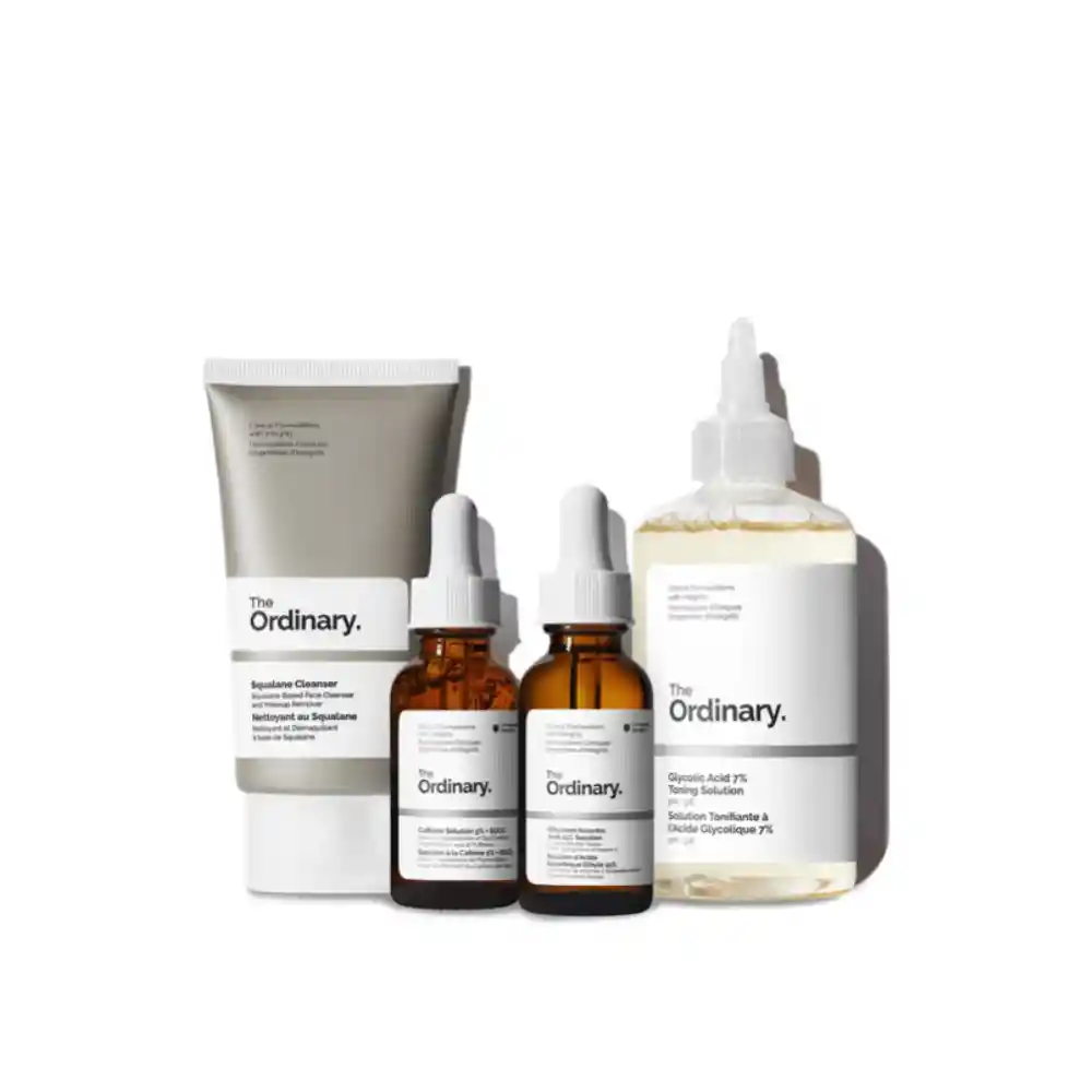 Qué es: Un set que limpia suavemente la piel, combate la apariencia de las ojeras, promueve una piel visiblemente radiante y de aspecto saludable, y proporciona una exfoliación suave. Tipo de piel: Normal, Mixta y Grasa Qué más necesitas saber: - Squalane Cleanse 30ml : Combate la apariencia de las ojeras y la hinchazón debajo del área de los ojos. - Solución de cafeína al 5% + EGCG 30ml: Combate la apariencia de las ojeras y la hinchazón debajo de la zona de los ojos. - Solución de Ácido Ascórbico Etilado al 15 % 30ml: Una solución altamente estable, sin agua, de ácido L-ascórbico etilado al 15 % (una forma de vitamina C) que combate el tono desigual de la piel, la opacidad y los signos de la edad. - Solución Tonificante de Ácido Glicólico al 7 % 240ml: Una solución tonificante de alfahidroxiácidos (AHA) que ofrece una exfoliación suave de la superficie de la piel para una luminosidad y claridad visiblemente mejoradas. Preocupaciones de cuidado de la piel: Líneas finas/arrugas, acné/imperfecciones y ojeras Indicaciones de los ingredientes: Libre de parabenos, formaldehídos, agentes liberadores de formaldehído, ftalatos, aceite mineral, palmitato de retinilo, oxibenzona, alquitrán de hulla, hidroquinona, sulfatos SLS y SLES, triclocarbán, triclosán, y contiene menos del uno por ciento de fragancia sintética. Estos productos también son veganos, sin gluten y libres de crueldad animal.