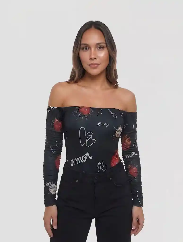 El equilibrio perfecto entre sensualidad y libertad. Su escote tipo bandeja enmarca los hombros y la clavícula con un aire sutilmente romántico, mientras las mangas en malla aportan ligereza y movimiento. Una silueta que resalta sin esfuerzo y se adapta al cuerpo como una segunda piel. Su tejido suave y elástico brinda comodidad real: sin presión, sin incomodidades, solo fluidez para acompañarte en cada momento del día o la noche. El estampado le suma carácter, convirtiéndolo en una pieza versátil que eleva cualquier look. Perfecto para llevar con pantalones amplios y crear ese contraste entre ajuste y libertad que estiliza la silueta. Hecho con amor por mujeres colombianas