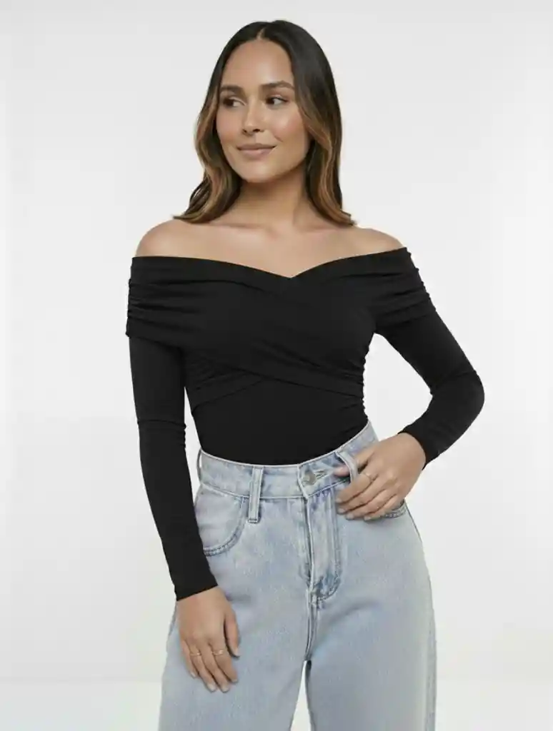 ✨Body de escote cruzado off-shoulder, con un ajuste suave y elegante. Su tela elástica ofrece comodidad todo el día y un look femenino perfecto para cualquier ocasión. 🏃🏻♀️ Tela que no se arruga: ideal para llevar en maleta sin preocupaciones ☀ Tela suave, elástica y fresca, perfecta para cualquier clima 👗 Diseño ajustado tipo envolvente 🧵 Hecho responsablemente por mujeres colombianas: moda con propósito 📏 Cubre de la talla S a la XL (talla única) 👖 Material: 90% poliéster y 10% spandex 📸 La modelo mide 1.70 m y usa talla SM