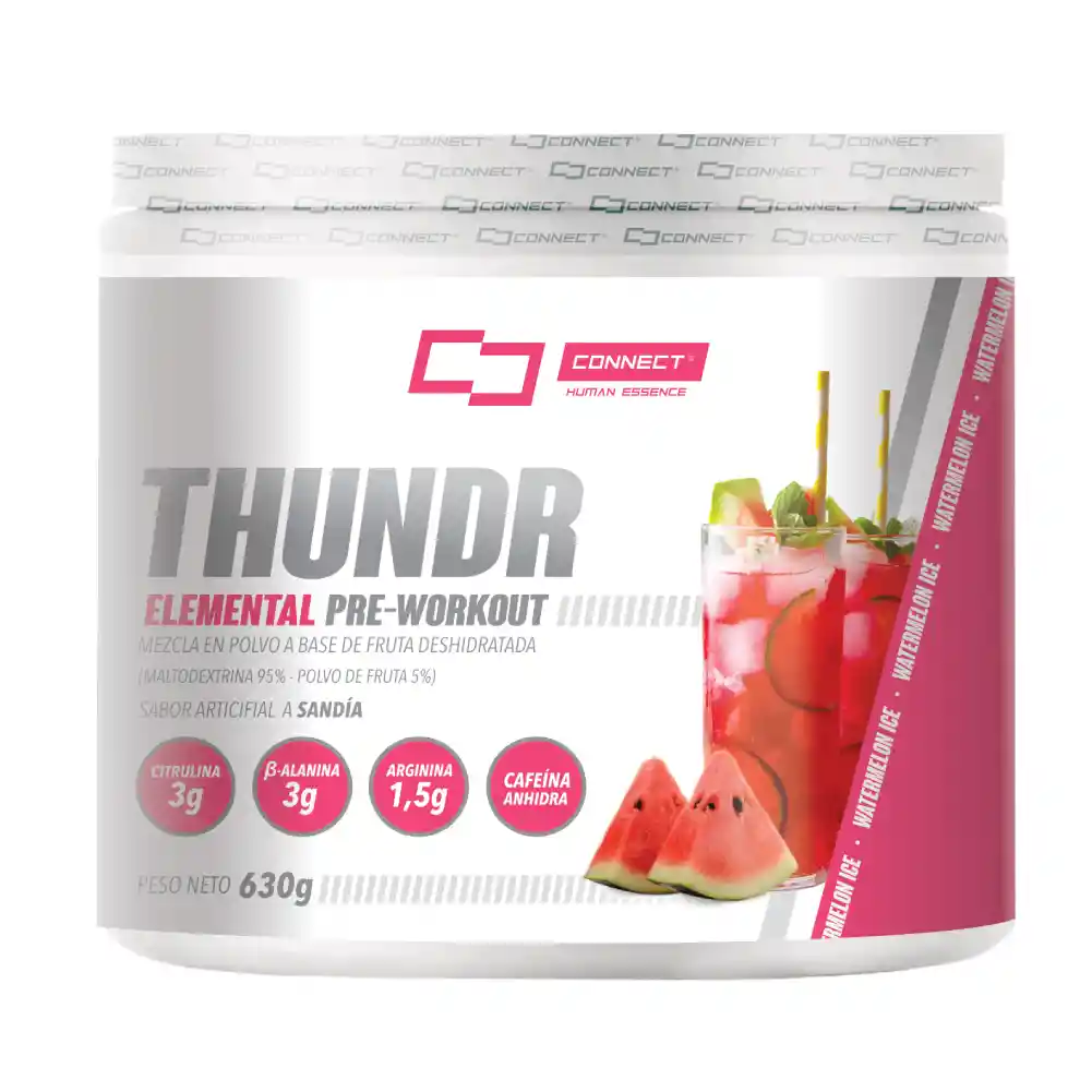 La suplementación antes del entrenamiento (pre-entreno) está dirigida a mejorar la capacidad, rendimiento y resistencia del deportista o de cualquier persona que tenga la intención de optimizar sus tiempos, cargas y resultados al momento de ejercitarse. En Connect hemos desarrollado dos productos orientados a cubrir con las necesidades del público en general, teniendo en cuenta los diferentes objetivos que puedan plantearse. Este suplemento fue desarrollado con una base de polvo de fruta deshidratada que si bien es cierto son azúcares concentrados, las cantidades son mínimas y no afectarán en lo absoluto tu aporte calórico diario ni tus resultados físicos así estés en periodos en los que quieres disminuir tus porcentajes de grasa corporal. Thundr Elemental: Este es el suplemento ideal para aquellos que quieren mejorar su energía y rendimiento, pensado para todas las personas que quieren pasar su entrenamiento a un nivel superior. Las dósis de citrulina, la Beta Alanina y arginina por servicio son apenas suficientes para lograr también mejorar el rendimiento, flujo sanguíneo muscular y retraso de la fatiga percibida a esfuerzos intensos o de larga duración. Por tener aún una dosis de cafeína anhidra capaces de lograr ese estímulo te recomendamos tomarlo con precaución sin eres sensible a este tipo de suplementos. Lo ideal es consumirlo entre 15 y 30 minutos antes de tu actividad física.