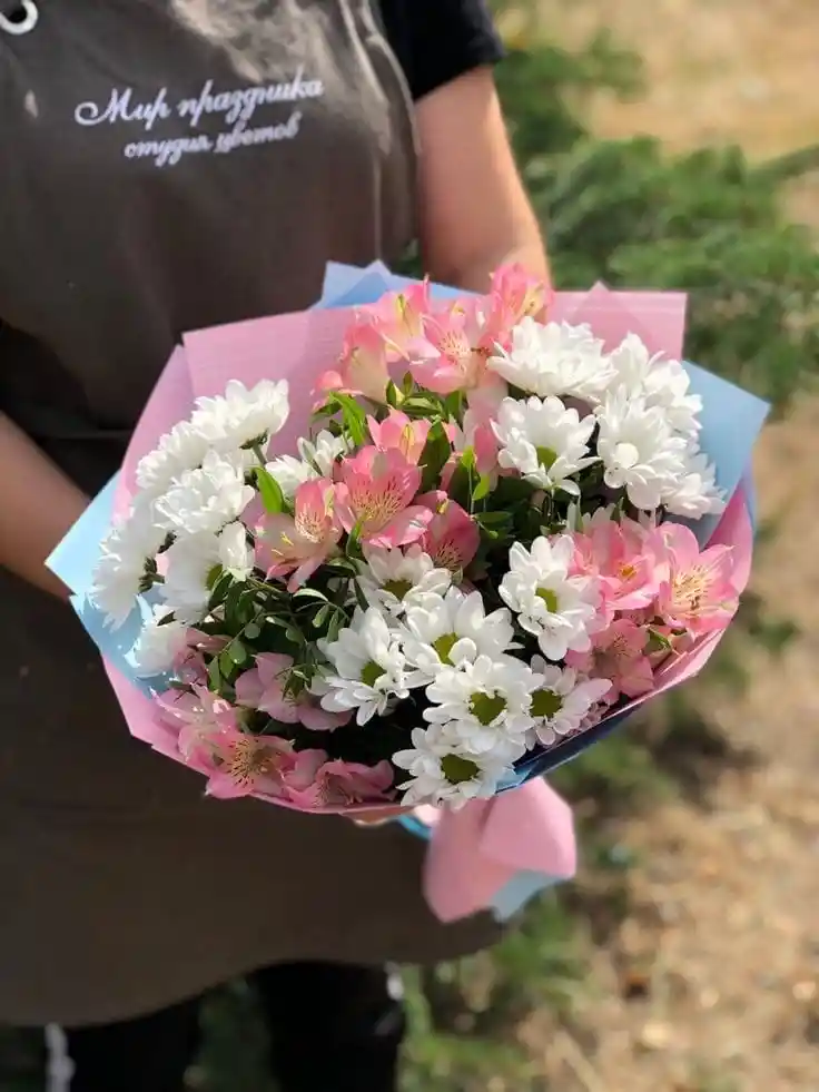 Incluye: pte de margaritas blancas, pte de astromelias rosadas, decoracion y mensaje personalizado