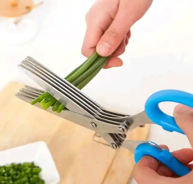 PRACTICAS TIJERAS 5 HOJAS Corta tus vegetales de forma rápida y sencilla con estas tijeras especiales para cocina! Con este práctico utensilio, podrás preparar tus comidas de manera más eficiente. Olvídate de los cortes desiguales y ahorra tiempo en la cocina. ¡Haz que cocinar sea más fácil y divertido.