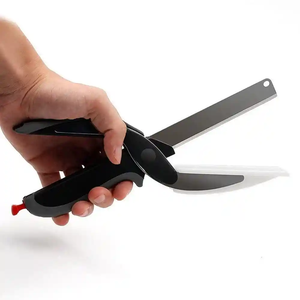 Cuchillo 2 en 1 y tabla de cortar. Es decir, este articulo sirve como picador en forma de tijeras, como cuchillo ademas de que tiene un pequeño soporte que simula una tabla de cortar. Corte los alimentos de forma rápida y segura sin la limpieza complicada.Combina las funciones de un par de tijeras de cocina con la de un cuchillo de cocina, lo que le permite cortar, picar, o tallar, cualquier ingrediente fresco, crudo o seco!Cuenta con una superficie de corte suave incorporado que la hace excepcionalmente higiénico, mientras que también elimina la necesidad de utilizar una tabla de cortar.Ficha Técnica:-Marca: Clever Cutter Modelo: Z138-Con agarre ergonómico, fácil para las manos.-Material de la hoja: Lamina de Acero inoxidable-Material del soporte: Plástico-Longitud: 25CM Color: NegroGarantía:1 mes por defectos de fabrica.Es indispensable regresar el producto en su caja original y con los accesorios completos.