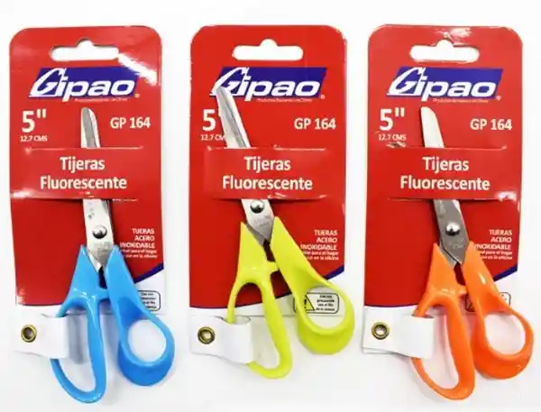 REFERENCIA: GP 164 PRESENTACIÓN: Empaque Individual TAMAÑO: 17.5 x 7.5 cms Tijeras de 5” (12.7 cms) De acero inoxidable de alta calidad Mango de plástico fluorescente Hojas de 1.5 mm Nota: Se envía cualquiera de las referencias surtidas que están en las imágenes.