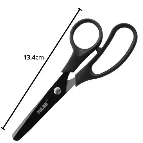tijeras punta redonda modelo basic, es de la serie Shadow de la marca Milan. Hoja y Mango de color negro. Hoja de acero inoxidable y punta redondeada. Mango de plástico. Ideal para uso escolar ya que son seguras, de tamaño mediano y con un agarre cómodo. Útil para tareas extensas y complicadas que demanden tiempo porque son tijeras que no causan cansancio en el agarre y podrá cortar muy exactamente en actividades difíciles durante mucho tiempo sin cansarse. Las medidas son 13,4 x 5,3 x 1,1 centímetros. Propiedades de alta calidad en fabricación y materiales, tiene un buen filo, las hojas son de metal resistente, que mantendrá cortando fácilmente durante mucho tiempo de uso. Herramienta mediana, con un peso liviano que genera rapidez y seguridad necesaria para el uso escolar.