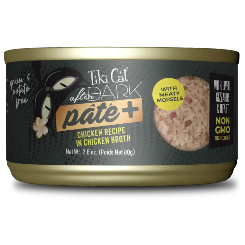 Receta de pollo Como carnívoros obligados, los gatos tienen un instinto natural de cazar después del anochecer y una necesidad nutricional de comer carne. Tiki Cat® After Dark® Pâté+ es el sueño de los amantes de la carne, ya que imita de cerca la dieta natural de los gatos basada en presas.