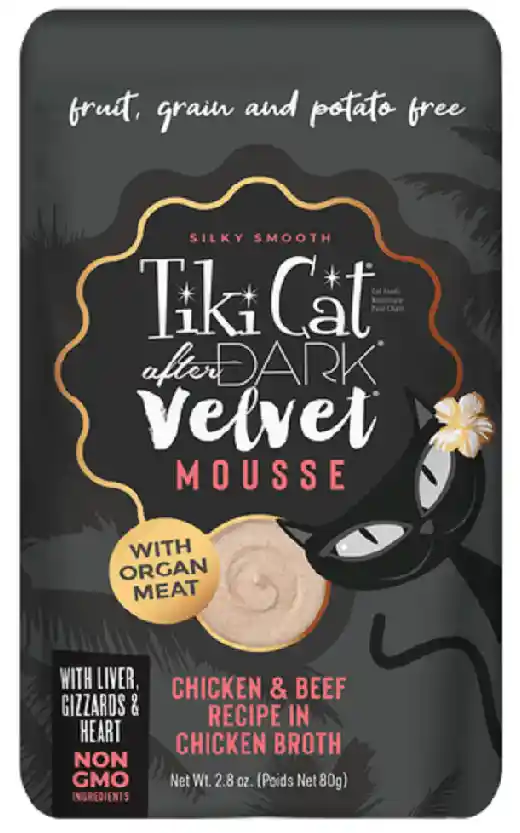 Tiki Cat After Dark Velvet Mousse es el sueño de los amantes de la carne. Este alimento imita de cerca las dietas naturales de las presas de los gatos, pero en una deliciosa forma de mousse suave y cremosa. Es perfecto para los gatos quisquillosos con la comida, gracias a su textura suave y lamible. Además, está lleno de carne de vísceras irresistible, como pollo, ternera, hígado, molleja y corazón de pollo, ofreciendo una nutrición rica y sabrosa.