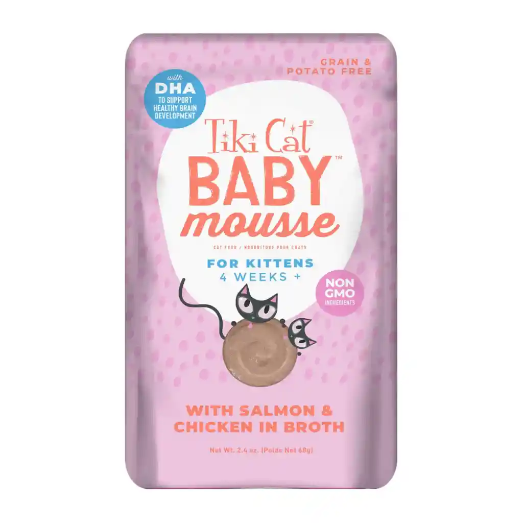 Tiki Cat Baby Pouch Mousse Salmón suave y sedosa con salmón y pollo es la opción ideal para nutrir a tu gatito durante sus primeros meses de vida. Con DHA para un desarrollo cerebral óptimo y fibras suaves para una digestión fácil. Salmón, pollo e hígado auténticos Textura suave y fácil de preparar, proteínas de alta calidad y nutrientes antioxidantes. Ingredientes 100% libres de OGM Sin cereales