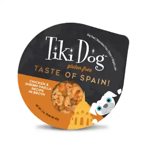 Tiki Dog Taste of Spain es un alimento húmedo de alta calidad para perros, inspirado en la receta tradicional de paella de pollo y camarones en caldo. Esta fórmula libre de gluten ofrece una experiencia gourmet con ingredientes reales y visibles, proporcionando una hidratación adicional y un sabor irresistible incluso para los paladares más exigentes. Presentado en una práctica copa de 85g (3 oz), es ideal como una comida completa y balanceada o como un delicioso acompañamiento para realzar el alimento seco diario de tu mascota.