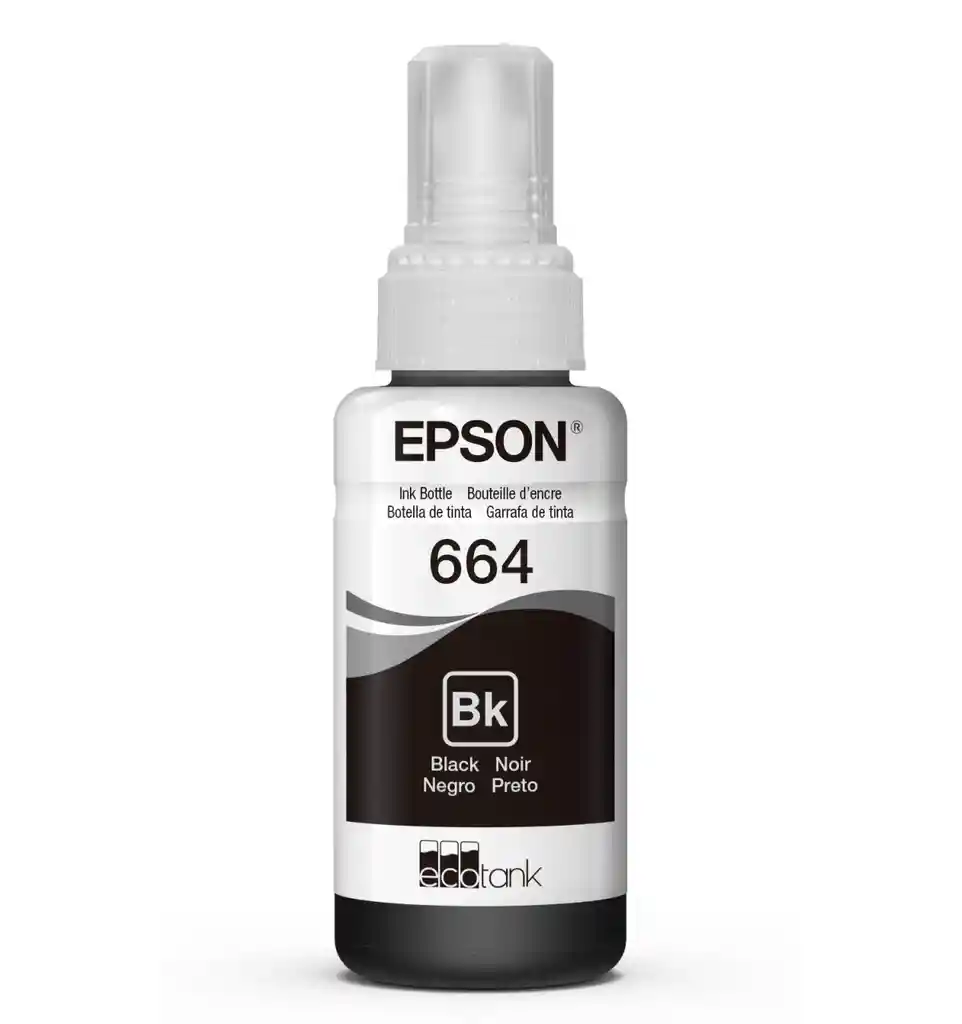 Botella de tinta para impresora Epson original T664 color negro de 70.0ml. Ideal para impresoras EcoTank, ofrece alto rendimiento a bajo costo.