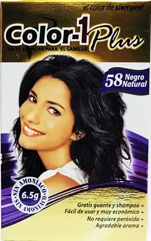 Tinte, 58 Color 1 Plus, Negro Natural, Sin Amoniaco, En Polvo Para el Cabello - 6.5 Gr. + Guantes + Champú.