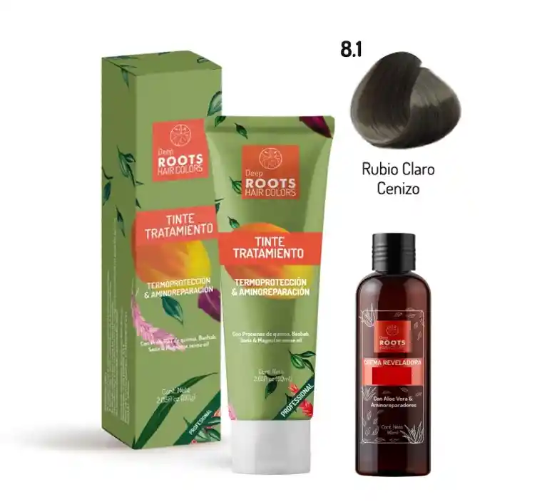 TINTE TRATAMIENTO 8.1 Rubio Claro Cenizo Contiene: - Tubo tinte 60ml - Oxigenta 90ml - Sachet tratamiento DEEP ROOTS COLORS Es un tratamiento profundo de coloración permanente con termoprotección, rico en activos naturales que le confieren propiedades hidratantes, reparadoras y nutritivas. DEEP ROOTS COLORS con su fórmula innovadora que incorpora ingredientes de última generación, permite una excelente fijación del color, reafirmando el tono natural de su cabello y cubriendo canas hasta el 100% con un bajo porcentaje de amoniaco, que garantiza colores intensos, luminosos y duraderos.