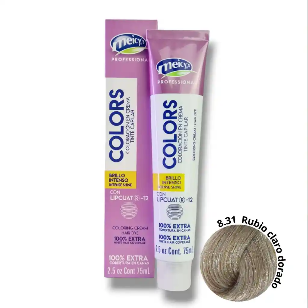 🌸✨ ¡Brilla con confianza, chica Meicy’s! 💜💁‍♀️ Descubre el Tinte Meicy’s Colors 8.31 Rubio Claro Dorado 🌼🌟 — tu secreto para un cabello luminoso, suave y con un toque dorado encantador. Este tinte profesional 💇‍♀️ te da un brillo intenso y una cobertura total de canas 🌈, mientras cuida tu melena gracias a su fórmula con Lipcuat®-12, que deja tu cabello hidratado, fuerte y con un acabado de salón 💫💖. Perfecto para chicas que aman verse naturales, radiantes y con estilo 💕🌞 ¡Porque tu cabello también merece un toque de magia y color! ✨💜