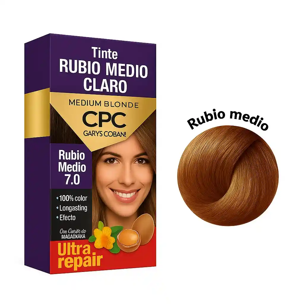 💛 Tinte CPC Meicys 7.0 Rubio Medio – Coloración Permanente Ultra Repair x50ml 🌼 Color natural, brillo intenso y nutrición profunda El Tinte CPC Meicys 7.0 Rubio Medio ofrece un tono rubio equilibrado y luminoso, ideal para quienes buscan un color natural con reflejos cálidos y radiantes. Su fórmula profesional Ultra Repair proporciona color uniforme, duradero y 100 % cobertura de canas, mientras nutre, repara y protege el cabello durante la coloración. ✨ Beneficios principales 💛 Tono rubio medio natural y brillante, con acabado suave y luminoso. 💯 Cobertura total de canas, incluso en cabellos rebeldes. 💧 Hidratación y nutrición profunda, gracias a su fórmula con aceite de coco y almendras. 🌟 Brillo extremo y color duradero con la tecnología Nutricolor, que sella la cutícula. 🧬 Fórmula Ultra Repair: fortalece la fibra capilar y evita el daño durante la coloración. 🧪 Contenido del kit 1 tubo de Tinte CPC de 50 ml 1 sachet de Crema Oxidante (Oxi Cream) de 75 ml 💆 Modo de uso Mezcla el tinte con la crema oxidante hasta obtener una mezcla homogénea. Aplica sobre el cabello seco y sin lavar. Deja actuar de 30 a 40 minutos según la intensidad deseada. Enjuaga con abundante agua y aplica acondicionador o tratamiento capilar. 🌿 Ingredientes naturales 🥥 Aceite de coco: hidrata y suaviza la fibra capilar. 🌰 Aceite de almendras: nutre y aporta brillo natural. 💎 Sistema Nutricolor: prolonga la duración del color y mantiene su intensidad. 🪶 Ideal para Personas que buscan un rubio medio natural, luminoso y elegante. Cabellos con canas o dañados, que requieren nutrición y reparación. Uso doméstico o profesional.