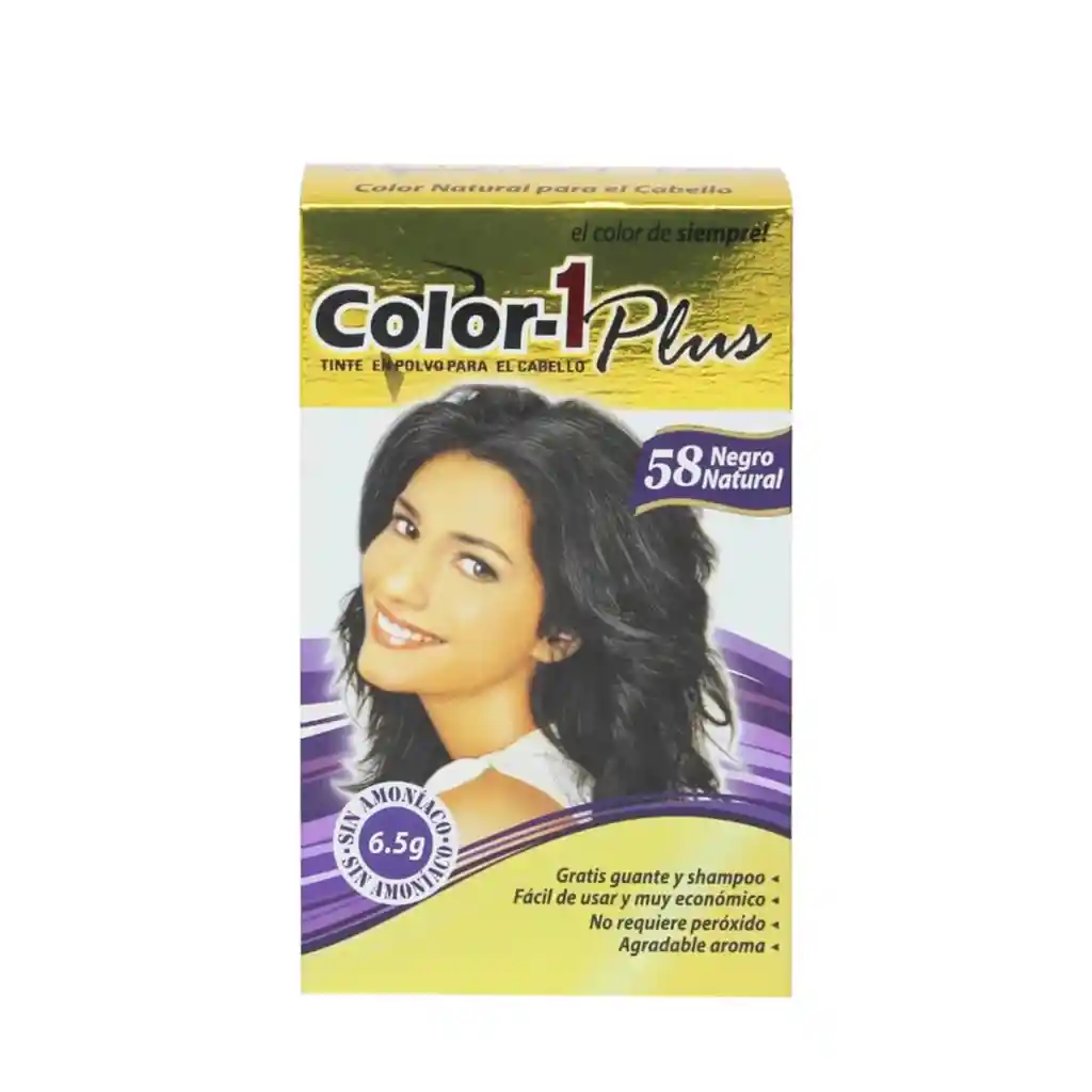 Tinte en Polvo Color-1 Plus sin amoniaco: Deja tu cabello suave y sedoso con la tintura Color-1 Plus,que te brinda una coloración permanente con colores vibrantes tapando el 100% de las canas. Tinte sin peróxidos ni aguas oxigenadas que revitaliza e hidrata tu cabello. Presentación: 6.5 G.