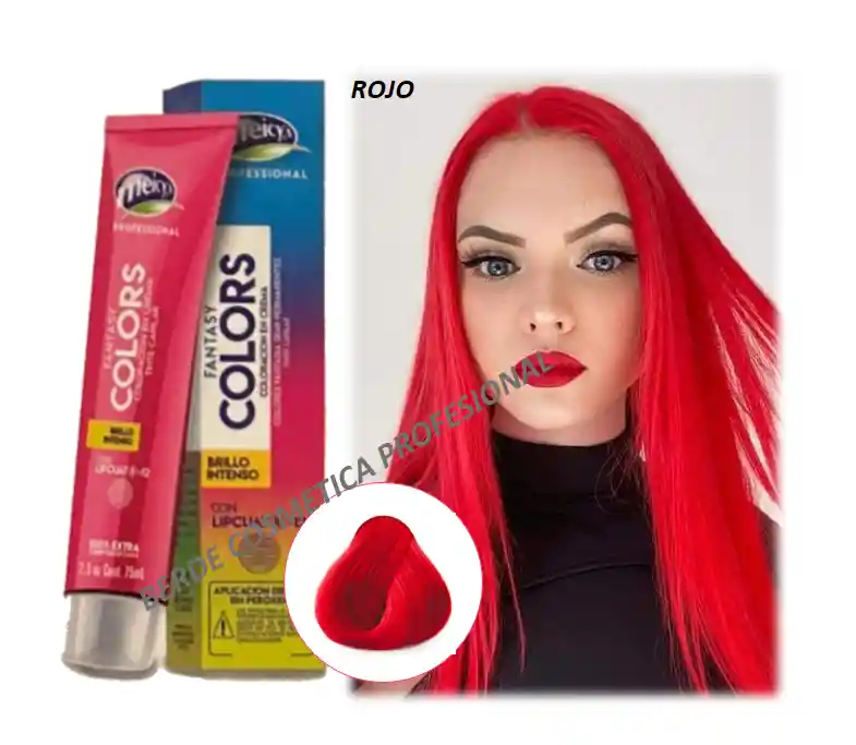 TINTE FANTASIA ROJO TINTE MEICYS COLORS PROFESIONAL Contiene: - Tubo 75ml - Sachet de shampoo o tratamiento LA TINTURA SE APLICA DIRECTAMENTE SOBRE UNA DECOLORACIÓN ETAPA 10; LO QUE INDICA QUE EL CABELLO DEBE ESTAR COMPLETAMENTE DECOLORADO SIN RASTROS AMARILLOS, NARANJAS O CAFES. SI LA BASE NO ESTA MUY BIEN DECOLORADA EL TONO PUEDE QUE NO COJA O COJA PARCIALMENTE.