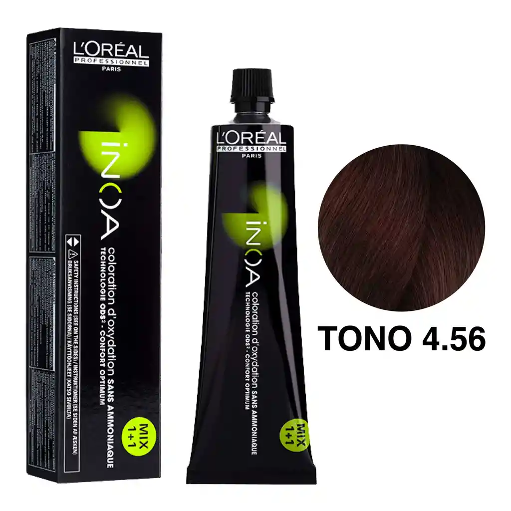 TINTE INOA DE L'OREAL PROFESSIONEL 4.56° Castaño Caoba Rojizo Sin Amonicaco *60 ml - Despacho inmediato Inoa, de L'Oréal Professionnel, es el sistema revolucionario de coloración permanente a base de aceite y sin amoniaco Los tintes Inoa Loreal no contienen olor ni amoniaco. Aportan un confort óptimo al cuero cabelludo. Cubrimiento del 100% de los cabellos blancos ¿QUE CONTIENE ESTA COMPRA? 1 tubo de 60 gr INOA. 1 oxidante INOA 60 ml (producto reenvasado, se empacan con 20 vol) 1 instrucciones de uso al interior del empaque NOTA: Si necesitas varios tintes de diferentes referencias y con diferentes especificaciones: Aplica a la compra de la cantidad que necesites de cualquier referencia. Una vez se acredite el pago verás la opción de enviarnos un mensaje. Nos escribes especificando que referencias quieres, con que oxidantes o especificaciones especiales que necesites. Será un gusto atenderte.