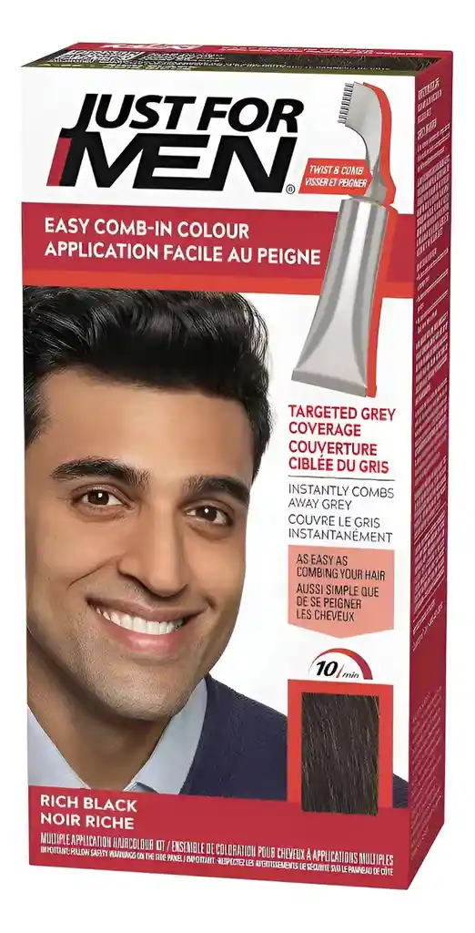 Just For Men - Tinte para el cabello para hombre, fácil de aplicar sin mezcla, con aplicador de peine, negro intenso, A-65 Color Negro intenso A-65 Información del empaque Tubo Beneficios del producto Coloración del pelo Marca Just for Men Forma del producto Equipo Nuevo aspecto y nombre, los mismos resultados infalibles; esta fórmula patentada detiene automáticamente la coloración después de 10 minutos, así que no quedará muy oscuro. La coloración de fácil aplicación con peine Just For Men, negro intenso, hace que deshacerte de tu cabello gris sea sencillo. Usar este producto de coloración de cabello sin mezclar para hombre es tan fácil como peinar tu cabello. Simplemente coloca el aplicador de peine al tubo de color premezclado, peina tu cabello para aplicar, espera diez minutos y enjuaga tu cabello en la regadera. Elige entre 11 tonos diferentes que van desde rubio arena a negro intenso. En caso de duda, siempre ve con un tono más claro. Nuestra fórmula suave no contiene amoniaco ni peróxido y fue mejorada para una mayor cobertura desde las raíces hasta las puntas. Nuestro producto no se lava, dura hasta 8 semanas hasta que las canas crecen; el aplicador de peine te ayuda a aplicarlo por todo tu cabello o en zonas específicas. A diferencia de otros colorantes, nuestra fórmula fácil y sin mezclar detiene la coloración después de diez minutos. Asegúrate de seguir todas las instrucciones incluidas en el paquete y realiza una prueba de alergia a la piel 48 horas antes de su uso. Garantía del vendedor: 30 días
