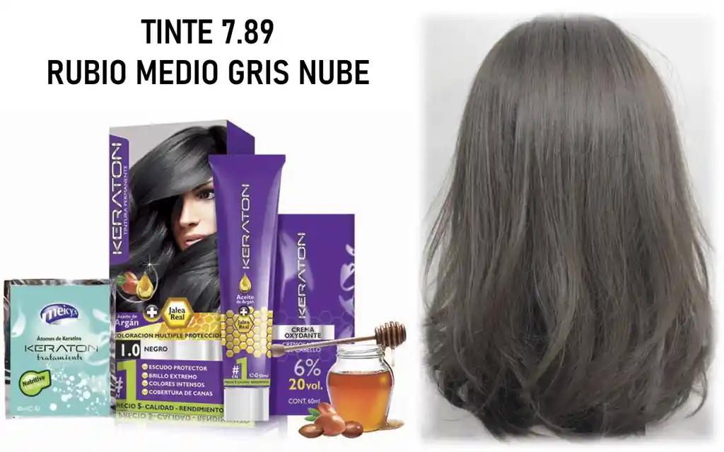 TINTE PERMANENTE KERATON CON ACEITE DE ARGAN Y JALEA REAL. TINTE 7.89 RUBIO MEDIO GRIS NUBE CONTIENE: - Tintura de 60ml. - Crema Oxidante 60ml. - Tratamiento en sachet x 30ml para después de la tintura. LA TINTURA SE APLICA DIRECTAMENTE PREFERIBLEMENTE CON OXIGENTA DE 10VL Y SOBRE UNA DECOLORACIÓN ETAPA 10; LO QUE INDICA QUE EL CABELLO DEBE ESTAR COMPLETAMENTE DECOLORADO SIN RASTROS AMARILLOS, NARANJAS O CAFES. NOTA: LA CALIDAD DEL COLOR DEL TINTE DEPENDE DE LA BASE DEL CABELLO, POR LO TANTO ES IMPORTANTE UN DIAGNOSTICO PREVIO AL CABELLO ANTES DE LA APLICACIÓN. DESCRIPCIÓN: Coloración capilar permanente en crema que proporciona una completa protección al cabello duran el proceso de coloración, gracias a su formulación con: ACEITE DE ARGAN rico en acido grasos como el omega 3, 6 y 9 el cual crea una nutrición excepcional en la fibra capilar debido a su poder antioxidante y complementado con la JALEA REAL la cual contiene una altísima concentración de nutrientes esenciales como glúcidos, proteínas, lípidos, vitamina B y E, ácido fólico, oligoelementos, sales minerales y aminoácido, entre otros componentes que nutren el cabello rápidamente devolviéndole el brillo, la sedosidad y la hidratación, protegiéndolo de las agresiones externas del clima. Gracias a esos dos activos naturales, KERATON TINTURA PERMANENTE ofrece finalmente una coloración múltiple y una protección antes, durante y después del proceso de coloración. NSOC83823-18CO