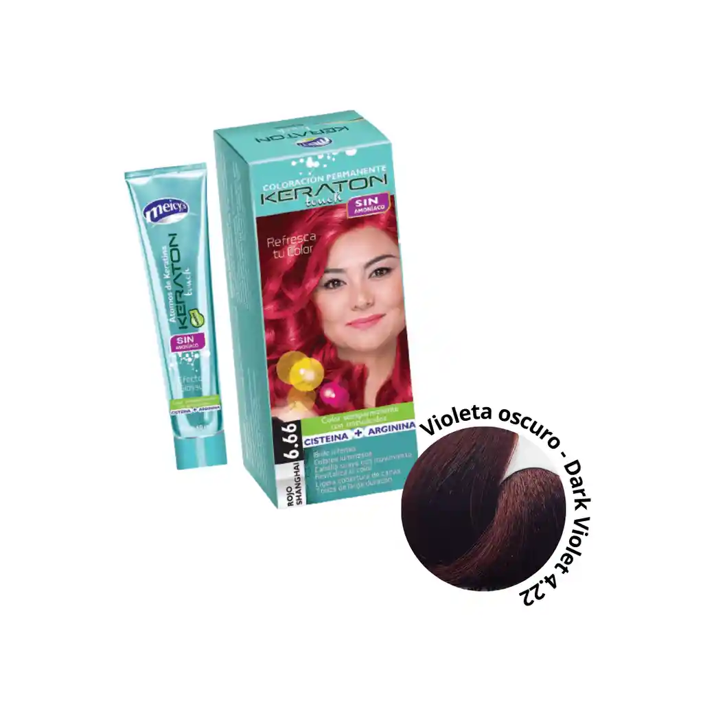 TINTE 4.22 VIOLETA OSCURO TINTE KERATON TOUCH (NO CONTIENE AMONIACO) Keraton Touch (Sin amoníaco) Presentación: - Tubo Colapsible 60 g. - Frasco Revelador de Color 90 ml. - Tratamiento Capilar sachet. Coloración sin amoníaco que cubre el cabello con reflejos brillantes, deslumbrantes y naturales con una óptima cobertura dejando un toque de suavidad, larga duración por su formulación de cisteina + argenina complementados con la keratina que aporta elasticidad y larga duración a la fibra capilar. Características: - Color semipermanente con aminoácidos - Brillo intenso, colores brillantes, suavidad y larga duración - Proporción de Mezcla 1: 1½ NOTA: LA CALIDAD DEL COLOR DEL TINTE DEPENDE DE LA BASE DEL CABELLO, POR LO TANTO ES IMPORTANTE UN DIAGNOSTICO PREVIO AL CABELLO ANTES DE LA APLICACIÓN.