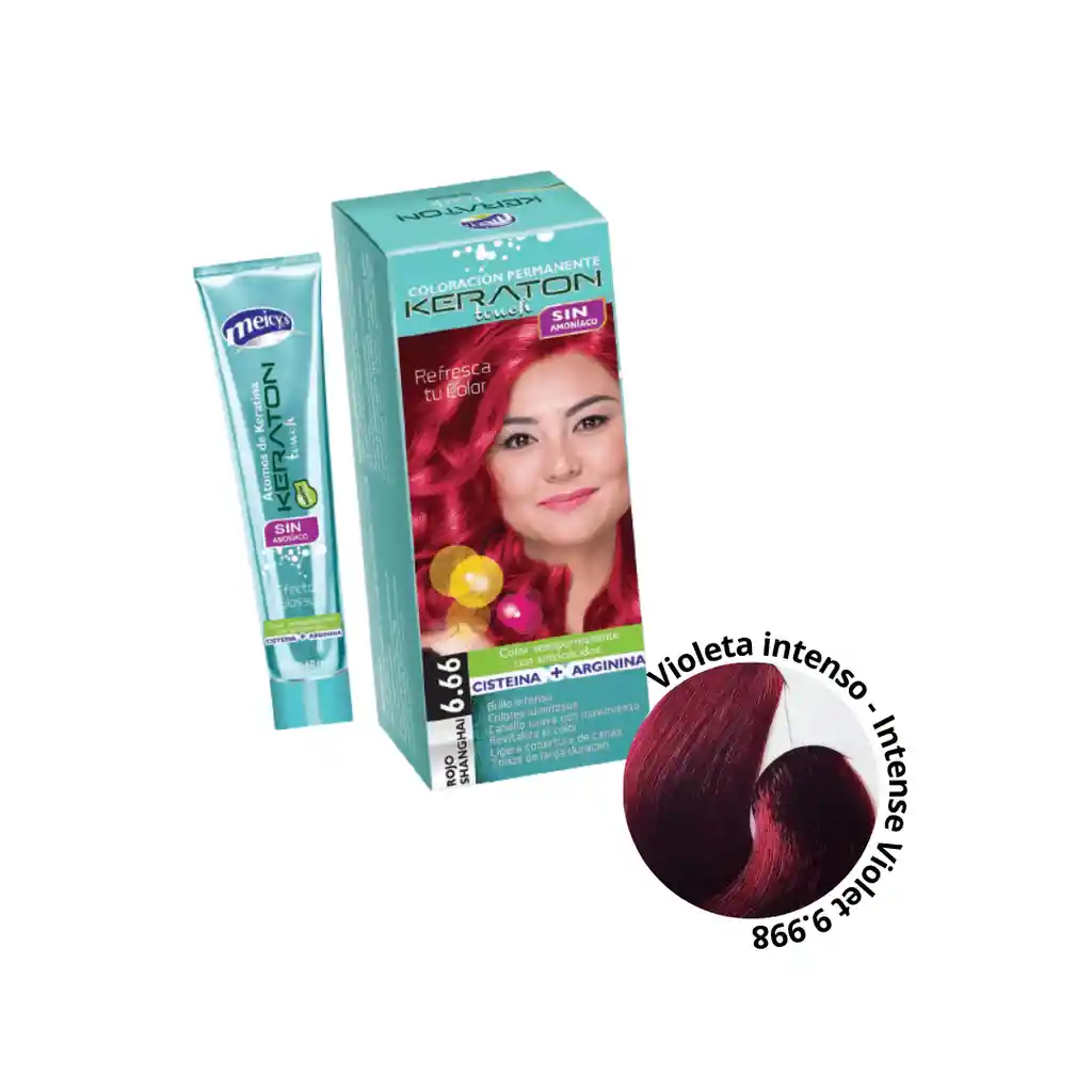 TINTE 9.998 VIOLETA INTENSO TINTE KERATON TOUCH (NO CONTIENE AMONIACO) Keraton Touch (Sin amoníaco) Presentación: - Tubo Colapsible 60 g. - Frasco Revelador de Color 90 ml. - Tratamiento Capilar sachet. Coloración sin amoníaco que cubre el cabello con reflejos brillantes, deslumbrantes y naturales con una óptima cobertura dejando un toque de suavidad, larga duración por su formulación de cisteina + argenina complementados con la keratina que aporta elasticidad y larga duración a la fibra capilar. Características: - Color semipermanente con aminoácidos - Brillo intenso, colores brillantes, suavidad y larga duración - Proporción de Mezcla 1: 1½ NSCO50462-12CO NOTA: LA CALIDAD DEL COLOR DEL TINTE DEPENDE DE LA BASE DEL CABELLO, POR LO TANTO ES IMPORTANTE UN DIAGNOSTICO PREVIO AL CABELLO ANTES DE LA APLICACIÓN.