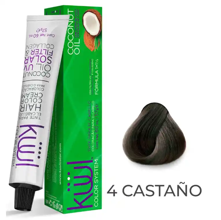 KUUL TINTURA PERMANENTE - TINTE 4 CASTAÑO GRATIS MASCARILLA REPARADORA (NO INCLUYE OXIGENTA) Contenido Neto: 90 ml e 3.04 fl oz. Se debe aplicar con oxigenta de 135ml (No incluida) DESCRIPCIÓN: Sistema de coloración que incorpora en su fórmula componentes nutritivos como la proteína de trigo y aceite mineral que brindan ingredientes esenciales para la regeneración del cabello, dando como resultado sedosidad, hidratación, brillo y color intenso. Gracias a su fórmula, Küül Color System aporta una mayor cantidad de pigmentos que prolongan la intensidad del color en el cabello y está enriquecido con filtro solar para una mayor protección.