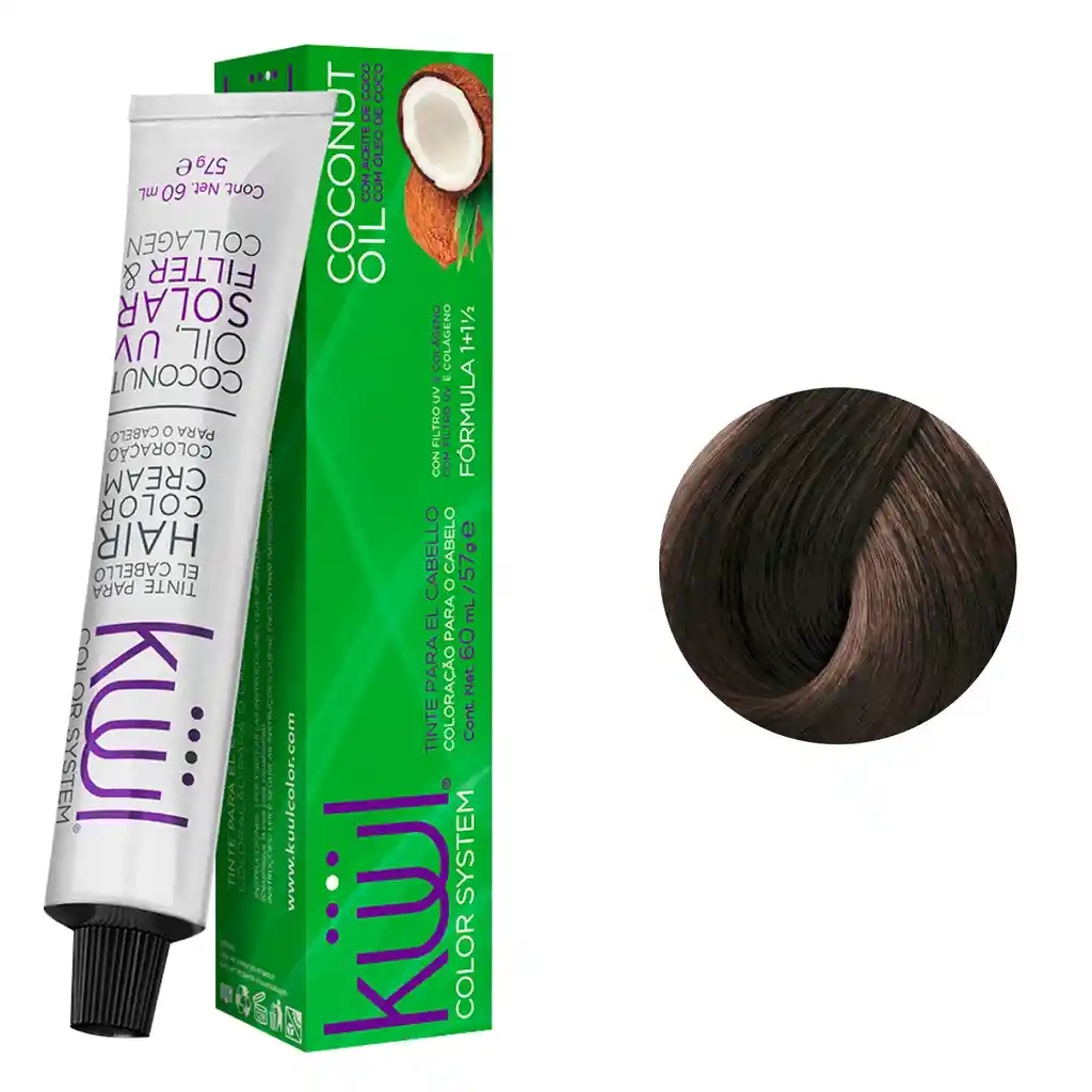 Sistema de coloración que incorpora en su fórmula componentes nutritivos como la proteína de trigo y aceite mineral que brindan ingredientes esenciales para la regeneración del cabello, dando como resultado sedosidad, hidratación, brillo y color intenso. Gracias a su fórmula, Küül Color System aporta una mayor cantidad de pigmentos que prolongan la intensidad del color en el cabello y está enriquecido con filtro solar para una mayor protección.  Beneficios: Tinta permanente. Cubre el 100% de cañas Devuelve naturalidad, fortaleza y brillo al cabello. Modo de uso: Una vez seleccionado el tinte y peróxido apropiado. Utilizar un recipiente no metálico. La fórmula es 1 + 1 1⁄2. Es decir, 60ml de tinte + 135 ml de peróxido. Debes aplicarlo con brocha y cabello seco. Cabello Natural: Aplique los medios a puntas y espere 20 minutos. Después aplica en la raíz y espera 30 minutos más. Enjuaga solo con agua.