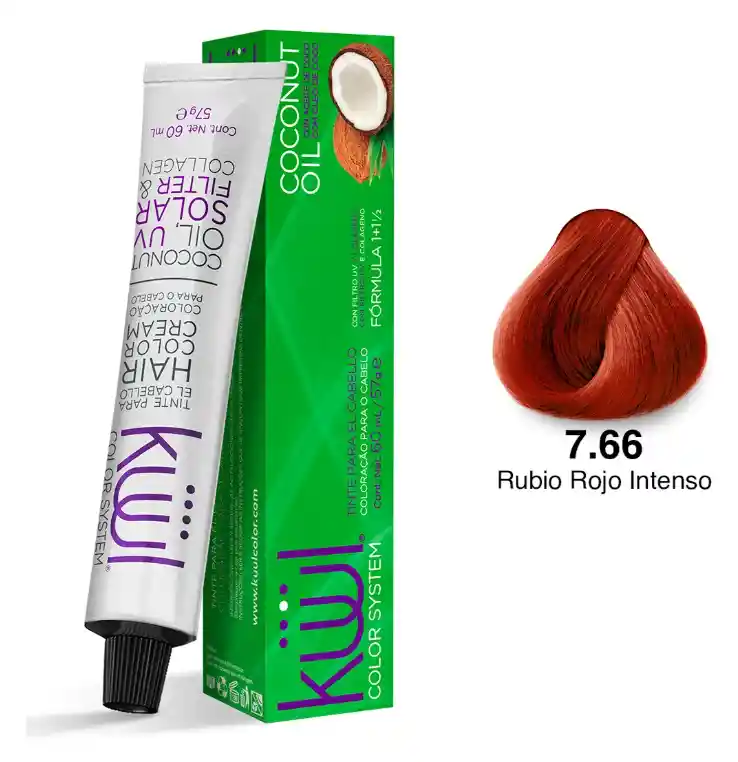 KUUL TINTURA PERMANENTE - TINTE 7.66 RUBIO ROJO INTENSO GRATIS MASCARILLA REPARADORA (NO INCLUYE OXIGENTA) Contenido Neto: 90 ml e 3.04 fl oz. Se debe aplicar con oxigenta de 135ml (No incluida) DESCRIPCIÓN: Sistema de coloración que incorpora en su fórmula componentes nutritivos como la proteína de trigo y aceite mineral que brindan ingredientes esenciales para la regeneración del cabello, dando como resultado sedosidad, hidratación, brillo y color intenso. Gracias a su fórmula, Küül Color System aporta una mayor cantidad de pigmentos que prolongan la intensidad del color en el cabello y está enriquecido con filtro solar para una mayor protección.