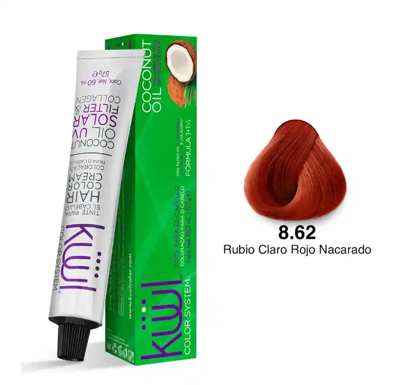 KUUL TINTURA PERMANENTE - TINTE 8.62 RUBIO CLARO ROJO NACARADO GRATIS MASCARILLA REPARADORA (NO INCLUYE OXIGENTA) Contenido Neto: 90 ml e 3.04 fl oz. Se debe aplicar con oxigenta de 135ml (No incluida) DESCRIPCIÓN: Sistema de coloración que incorpora en su fórmula componentes nutritivos como la proteína de trigo y aceite mineral que brindan ingredientes esenciales para la regeneración del cabello, dando como resultado sedosidad, hidratación, brillo y color intenso. Gracias a su fórmula, Küül Color System aporta una mayor cantidad de pigmentos que prolongan la intensidad del color en el cabello y está enriquecido con filtro solar para una mayor protección.