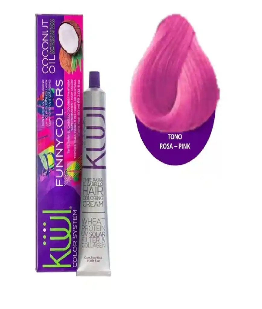 Tinte Kuul Funny Colors Rosa 90ml Sistema de coloración que incorpora en su fórmula componentes nutritivos como la proteína de trigo y aceite mineral que brindan ingredientes esenciales para la regeneración del cabello, dando como resultado sedosidad, hidratación, brillo y color intenso. Gracias a su fórmula, Küül Color System aporta una mayor cantidad de pigmentos que prolongan la intensidad del color en el cabello y está enriquecido con filtro solar para una mayor protección. Beneficios: Tinte permanente. Devuelve naturalidad, fortaleza y brillo al cabello. Modo de Uso: Una vez seleccionado el tinte y peróxido apropiado. Utilizar un recipiente no metálico. Utilizar el tinte de forma directa (sin peróxido). Debes de aplicarlo con brocha y cabello seco.