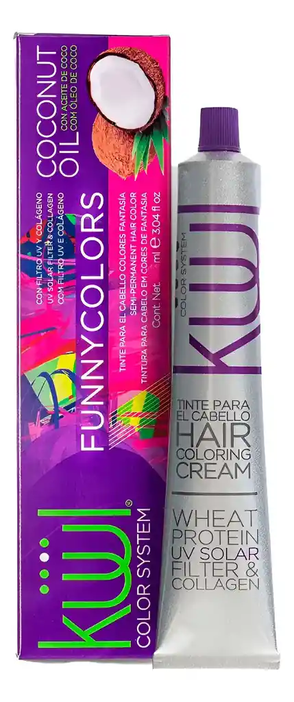 Los tintes Kuul Funny Colors son coloraciones semipermanentes de fantasía (60ml) que ofrecen tonos vibrantes y duraderos hasta por 40 lavadas, sin amoníaco ni necesidad de peróxido. Su fórmula nutritiva protege y aporta brillo, ideal para cambios audaces sobre bases previamente decoloradas (alturas 7, 9 o 10).