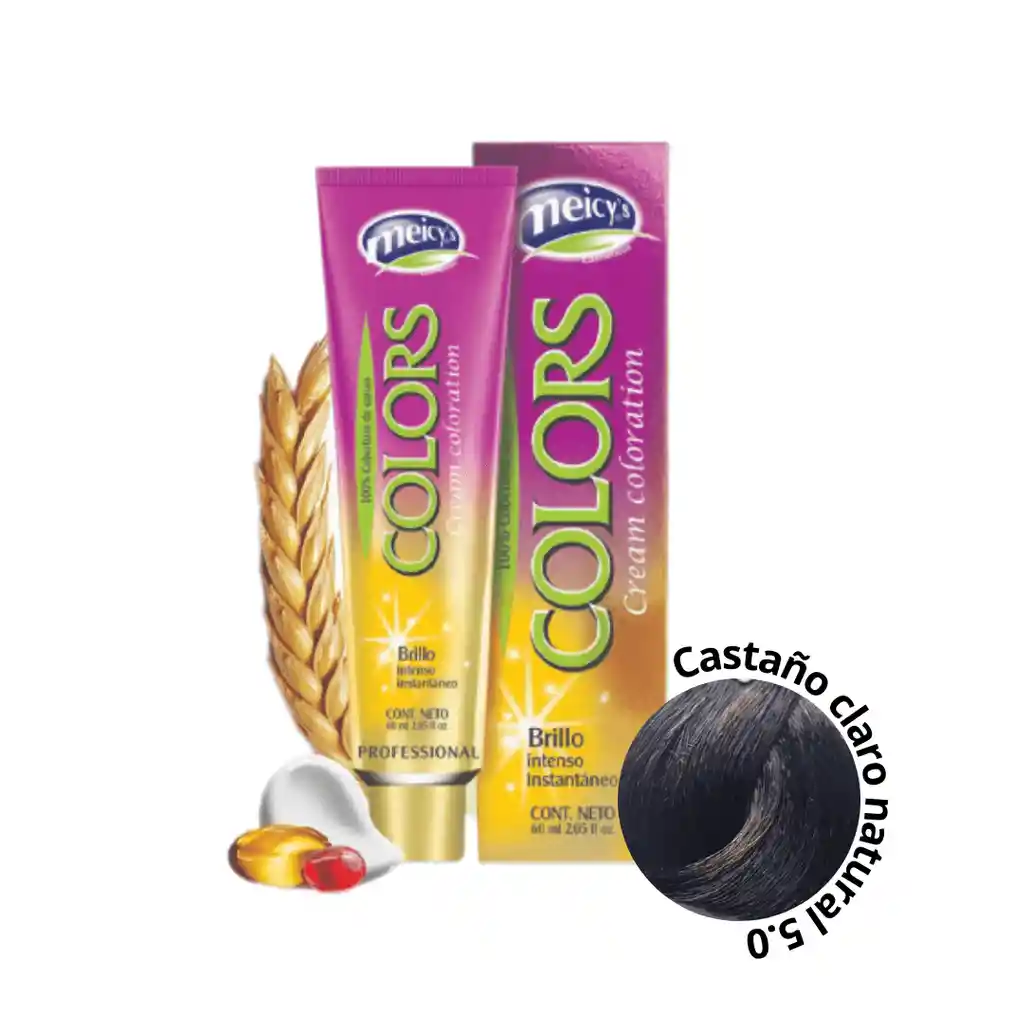TINTE PROFESIONAL PERMANENTE MEICY CASTAÑO CLARO 5.0 Presentación: - Tubo Colapsible 60 g. - Frasco Revelador de Color 90 ml. (Los tintes de fantasia no la incluyen) - Shampoo o Tratamiento Capilar 30 g. MEICYS COLORS Productos especializados con estudios de alta tecnología para el completo cuidado del color y para mantener la naturaleza del cabello, permitiendo así el control total del tono, suavidad y sedosidad en un solo proceso brindando alta fijación del color. Meicys Colors Molécula de alto poder reestructurante que aporta flexibilidad, color y brillo al cabello por más tiempo. Con adn vegetal y proteína hidrolizada. AMINOÁCIDO DE TRIGO CON SILICONA: Formado por vitaminas y proteínas hidrolizadas de trigo de origen natural y keratina que restauran y protegen el cabello durante el proceso de coloración aportando brillo natural. Los tintes de fantasia se aplican sin oxigenta sobre un cabello altura 10. (Los tintes de fantasia no incluyen oxigenta)