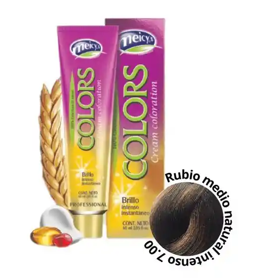 TINTE PROFESIONAL PERMANENTE MEICY RUBIO MEDIO NATURAL INTENSO 7.00 Presentación: - Tubo Colapsible 60 g. - Revelador de Color 90 ml. - Shampoo o Tratamiento Capilar 30 g. MEICYS COLORS Productos especializados con estudios de alta tecnología para el completo cuidado del color y para mantener la naturaleza del cabello, permitiendo así el control total del tono, suavidad y sedosidad en un solo proceso brindando alta fijación del color. Molécula de alto poder reestructurante que aporta flexibilidad, color y brillo al cabello por más tiempo. Con adn vegetal y proteína hidrolizada. AMINOÁCIDO DE TRIGO CON SILICONA: Formado por vitaminas y proteínas hidrolizadas de trigo de origen natural y keratina que restauran y protegen el cabello durante el proceso de coloración aportando brillo natural.