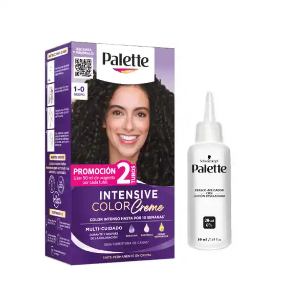 "Palette Intensive Color Creme tu aliado para un color intenso y duradero¹ con 100% cobertura de canas², ahora con NUEVA FÓRMULA MULTI-CUIDADO³ protege y brinda cuidado integral durante y después de la coloración. - Contiene Keratina, Pantenol y Serum Reparador. - Tinte Permanente en crema. - Marca #1 en coloración en Colombia⁴ . Llena tu mundo de alegría con colores intensos y duraderos. ¹ Intensidad de color hasta por 10 semanas según prueba instrumental ² Hasta 100% dependiendo del tono del tinte. El uso combinado con un tono natural puede lograr un 100% cubrimiento de canas ³Con el uso del tratamiento fijador de color y tratamiento reactivador de cuidado ⁴ Cálculos de HENKEL basados en parte en datos reportados por NielsenIQ mediante el servicio Retail Index para la categoría Tinturas y decolorantes al año móvil 2023 (enero 2023 a diciembre 2023) para Total Colombia (Derechos reservados® 2023, The Nielsen Company)"
