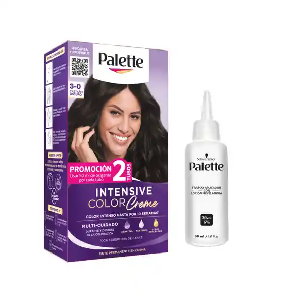 "Palette Intensive Color Creme tu aliado para un color intenso y duradero¹ con 100% cobertura de canas², ahora con NUEVA FÓRMULA MULTI-CUIDADO³ protege y brinda cuidado integral durante y después de la coloración. - Contiene Keratina, Pantenol y Serum Reparador. - Tinte Permanente en crema. - Marca #1 en coloración en Colombia⁴ . Llena tu mundo de alegría con colores intensos y duraderos. ¹ Intensidad de color hasta por 10 semanas según prueba instrumental ² Hasta 100% dependiendo del tono del tinte. El uso combinado con un tono natural puede lograr un 100% cubrimiento de canas ³Con el uso del tratamiento fijador de color y tratamiento reactivador de cuidado ⁴ Cálculos de HENKEL basados en parte en datos reportados por NielsenIQ mediante el servicio Retail Index para la categoría Tinturas y decolorantes al año móvil 2023 (enero 2023 a diciembre 2023) para Total Colombia (Derechos reservados® 2023, The Nielsen Company)"