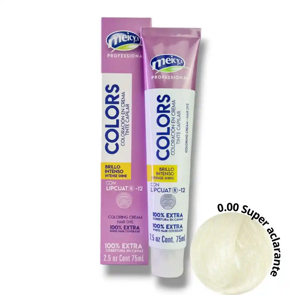 TINTE PROFESIONAL PERMANENTE MEICY SUPER ACLARANTE 0.00 Contiene: - Tinte capilar tubo 75ml - Crema oxidante capilar 113ml. - Sachet Shampoo o Tratamiento Capilar. Productos especializados con estudios de alta tecnología para el completo cuidado del color y para mantener la naturaleza del cabello, permitiendo así el control total del tono, suavidad y sedosidad en un solo proceso brindando alta fijación del color.