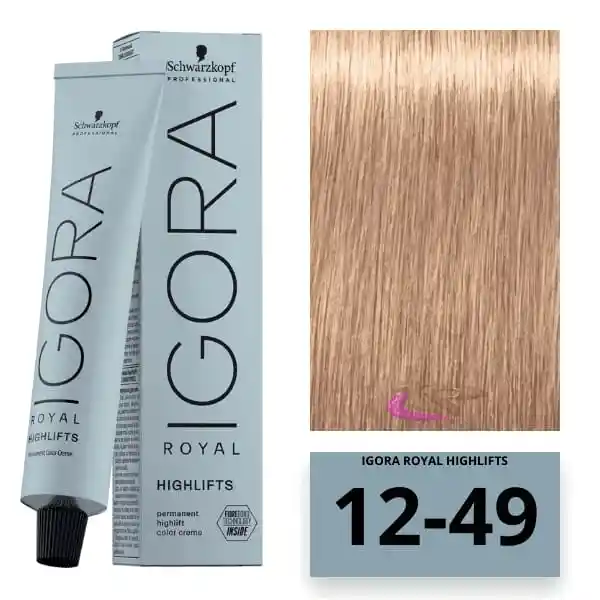 TINTURA IGORA ROYAL 12-49 SUPER ACLARANTE BEIGE VIOLETA 60 G : ha sido desarrollado por coloristas que te permite dar rienda suelta a tu creatividad proporcionándote las herramientas necesarias para transformar la imaginación a realidad, con resultados de color fieles a la carta de color y una fiabilidad superior incluso con los cabellos más exigentes.
