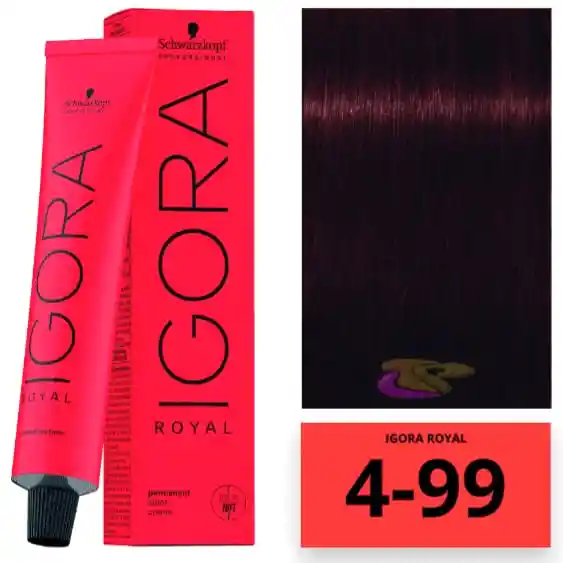 TINTURA IGORA ROYAL 4-99 CASTAÑO MEDIO VIOLETA INTENSO 60 G : ha sido desarrollado por coloristas que te permite dar rienda suelta a tu creatividad proporcionándote las herramientas necesarias para transformar la imaginación a realidad, con resultados de color fieles a la carta de color y una fiabilidad superior incluso con los cabellos más exigentes.