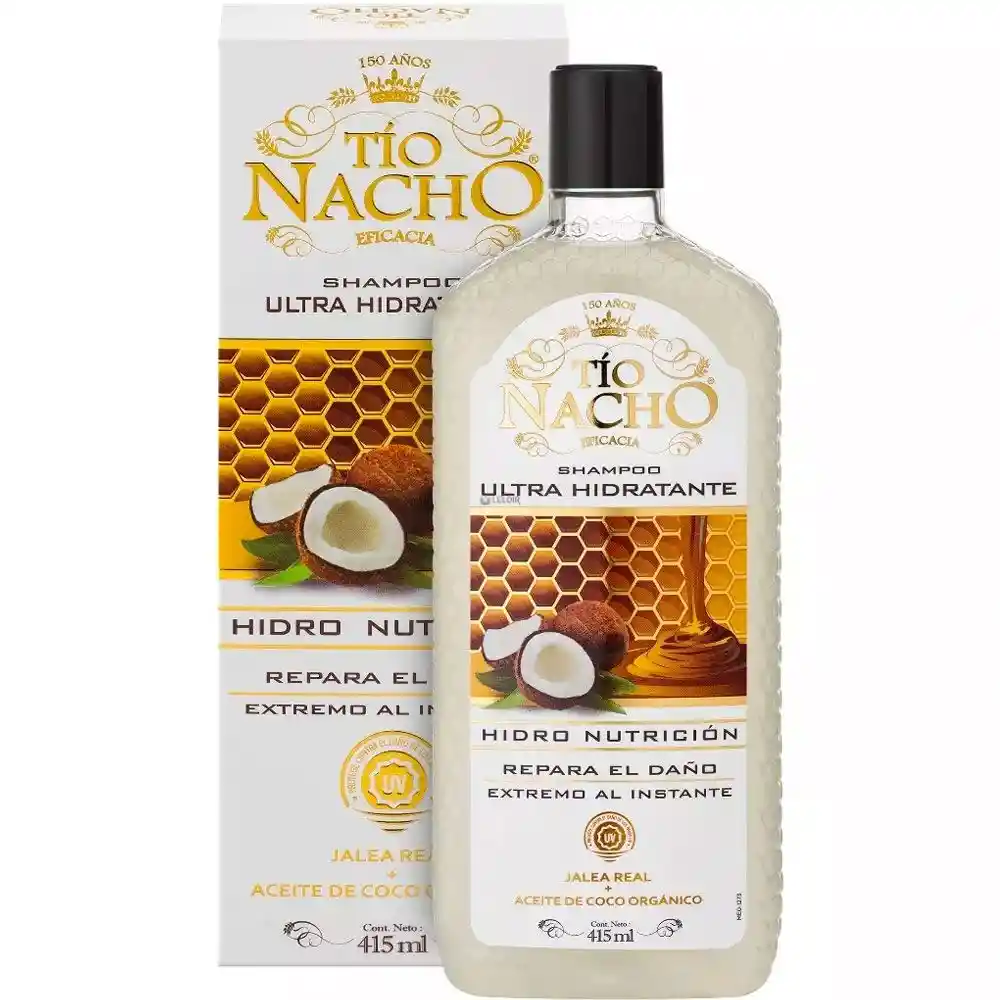 El Tío Nacho Shampoo Ultra Hidratante con Jalea Real y Aceite de Coco Orgánico actúa en cada hebra para devolverle la suavidad y brillo al pelo dañado. Su fórmula penetra y retiene la hidratación, devolviendo el 100% del agua perdida desde el primer uso.