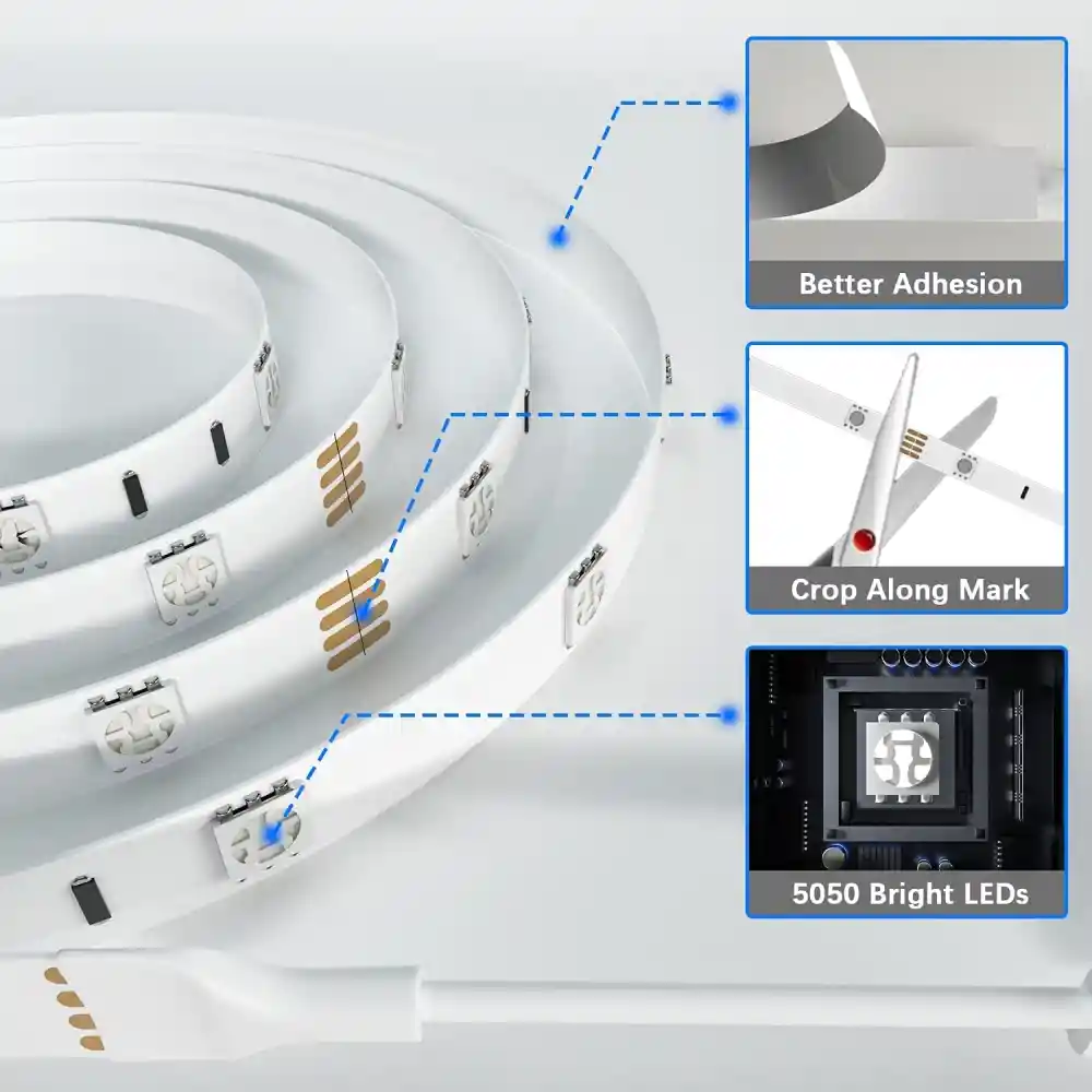De acuerdo con los comentarios de los consumidores, recientemente hemos realizado ajustes importantes: actualización del adhesivo conductor térmico. A medida que aumenta el tiempo de uso, aumenta la viscosidad. Pero no importa cuán bueno sea el adhesivo, la tira de luz de 30 m supera el tamaño y el peso de la convencional, por lo que preparamos un accesorio de refuerzo para resolver el problema de la caída de la tira de luz LED. Con la última tecnología patentada, hemos ampliado las tiras de luces hasta 10 m. Esta es la solución definitiva para rodear toda la habitación. Tira de luces LED WiFi para tu hogar inteligente: funciona con Google Home, Tuya y Alexa potente por Smart Life, control de voz, varios modos de color, múltiples modos de escena, ajuste de brillo, temporizador, sincronización de música (tiras de luces LED inteligentes integradas con micrófono de alta sensibilidad). se usa en el modo de música cuando las tiras de luces LED se usan en una fiesta y cambian según el ritmo). Utilizamos chips finos que reducen en gran medida la posibilidad de fallas en las perlas y mejoran el brillo y la eficiencia. Se implementaron varios procedimientos de control de calidad durante la fabricación y la seguridad del producto ha sido certificada por UL. Tira de luces LED para su hogar inteligente:Trabaje con Alexa, Google Home, control de voz, varios modos de color, múltiples modos de escena, ajuste de brillo, temporizador, sincronización de música (detección de música desde dentro y fuera del teléfono) (5G no es compatible) Nota: antes de conectarse a Alexa, escanee y descargue el código QR en la parte posterior del controlador, conecte la aplicación con su teléfono móvil y luego conéctese a Alexa Lo que obtienes en la compra 1 x Cinta Led Alexa 5 Metros (2 Rollos) 1 x Control Remoto 1 x Adaptador