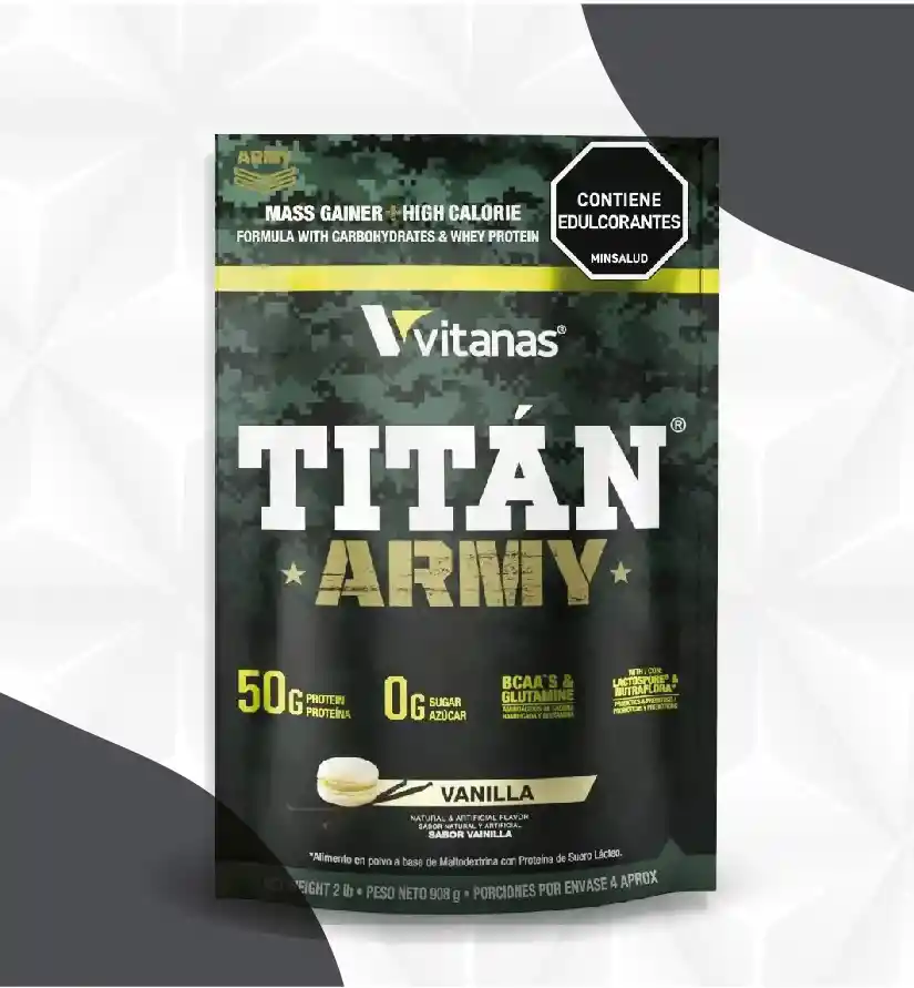 Titan Army 2 Libras Vitaminas (4 Servicios) Titán Army Proporciona un Alto Contenido en Carbohidratos Combinado Con Proteína s de Suero Para Ayudar a Recuperar Los Músculos Después de Cada Entrenamiento y Permitir el Crecimiento de Masa Muscular. Titán Army es Una Proteína Especialmente Diseñada Para Las Personas Que Buscan Adicionar Calorías a su Dieta. Maximizando la Ganancia de Masa Muscular. Con Titán Army se Puede Obtener un Delicioso Batido Cargado de Carbohidratos Que te Brindan Energía Por Más Tiempo. Un Máximo de Calorías Sin Azúcar. El Apoyo Perfecto Para un Entrenamiento Fuerte. Uso Recomendado: Adultos Tomar 1 Servicio(8 Cucharadas Dosificadoras) . Mezclar 1 Servicio de en 12Oz. De Agua en un Vaso o Shaker Hasta Obtener Una Mezcla Homogénea. Si Mezcla 1 Servicio en Leche Descremada o Baja en Grasa Obtendrá un Batido Cremoso y Con un Alto Contenido Calórico. Para Mejores Resultados Puede Adicionar Trozos de Frutas. Esto Aumenta el Contenido Calórico. Cuando Tomar Titán Army Antes: Antes de Entrenamiento Titán Army Aporta Carbohidratos Complejos. Una Buena Fuente de Energía. Después de Entrenar Titán Army Ayuda a la Recuperación Gracias a su Innovadora Formulación. En Cualquier Momento: Consumir en la Mañana. Entre Las Comidas o Después Del Entrenamiento. Si Prefiere. Puede Consumir la Mitad Del Servicio Dos Veces al Día.