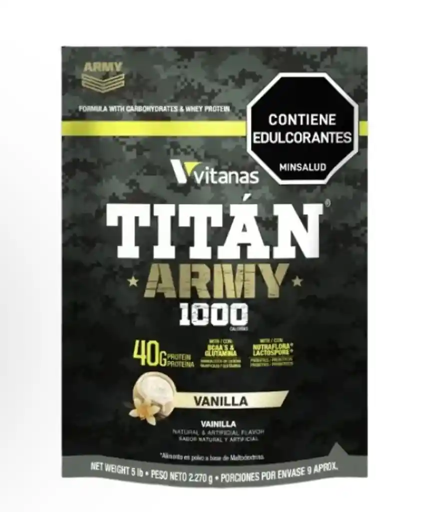 Titan Army 5 Lb de Vitanas es ideal para quienes buscan un aumento de masa muscular, energía y recuperación. Contiene proteínas y carbohidratos de liberación controlada. Producto registrado por Invima. Presentación: Tarro por 5 lb (2.27 kg). Dosis recomendada: 50 g (2 scoops). Servicios por tarro: 45 servicios.