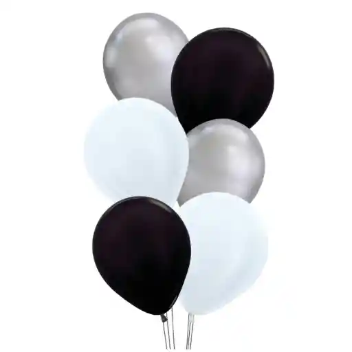 "Bouquet sencillo de 6 globos en helio. Incluye: - 2 globos negros en látex - 2 globos plateados en látex - 2 globos blancos en látex - Pesa sencilla Todos los globos contienen helio y gel de larga duración (3 días de duración). "