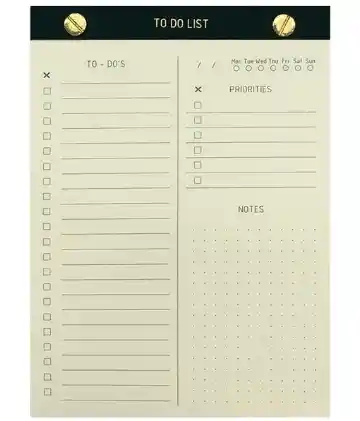 Sé productivo y organiza tu día con este Bloc de notas que incluye todo en uno. Sección de Lista de tareas, prioridades y notas. Especificaciones 80 hojas color marfil, 90 gms Hojas perforadas para fácil despliegue Tamaño 14 x 21 cm Detalle de portada y contraportada estampado al calor Encuadernación enblocado + tornillos dorados Papel certificado FSC